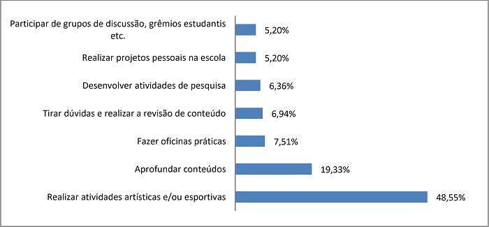 Para os estudantes que participaram do grupo focal, o “passar o dia inteiro na escola” levanta a necessidade de diversificar os tipos de atividades ofertadas na instituição escolar. Ao indagar no questionário ao universo de estudantes, investigando o que gostariam de fazer mais durante o tempo em que estão na escola, a opção “realizar atividades artísticas e/ou esportivas” (48,55%) se sobressaiu em relação ao conjunto de opções disponíveis de forma mutuamente excludente, como mostra o gráfico 2.