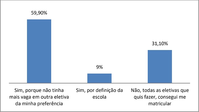Ao indagar ao universo de estudantes da 1ª série sobre o “fazer a eletiva por obrigação”, mais da metade (68,9%) afirmou sim, seja porque não havia mais vaga em outra eletiva da sua preferência (59,9%), seja por definição da gestão da escola (9%).