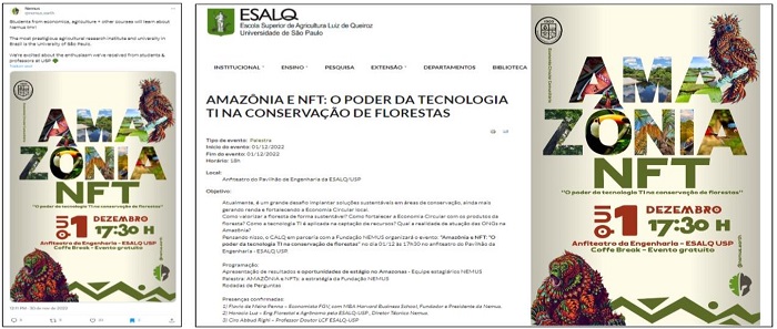 Entre as narrativas construídas pela Nemus opera uma lógica que explicita sua construção discursiva nos dois planos, físico e digital. A Nemus cita que atua com equipes “on the ground” e “in the ether” (Nemus, 2023a). Esse tipo de atuação multiespacial (no plano físico e digital) remete à construção de narrativas ideológicas pulverizadas em vários espaços — independentemente do público. Este tipo de distopia compreende que os espaços devem ser ocupados com estratégias diferentes em diferentes planos. Os públicos são diferentes, todavia são condensados em uma estratégia maior que conecta os diferentes espaços e as diferentes figuras, as quais são configuradas em um horizonte ideológico comum de pauta tecnoliberal neoextrativista. Por tecnoliberal entende-se que o principal personagem (o Capital) está em movimento nessa dinâmica. Nesse movimento o plano digital, em especial as plataformas de blockchain e as criptomoedas, opera em linha com a narrativa de proteção da floresta amazônica. Já por neoextrativista entende-se que esse mesmo personagem (o Capital) se apropria da ontologia dos povos originários, monetizando-a e comercializando-a nas plataformas de blockchain via criptomoedas.