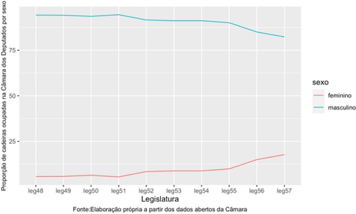 Nos anos 1990, a representação feminina evoluiu lentamente. Somente na 56ª Legislatura (01/02/2019 a 31/01/2023) as mulheres passaram a ocupar 15% das cadeiras, chegando a 17,7% na 57ª Legislatura (a partir de 01/02/2023). Esses números revelam uma sub-representação das mulheres em relação à bancada masculina (Perlin, 2019) (gráfico 1).