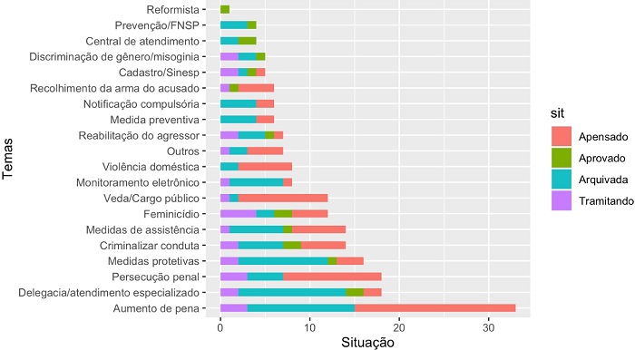 O gráfico 2 apresenta a situação do andamento das propostas analisadas por assunto (ver anexo 1). O aumento de pena de crimes já tipificados para enfrentar o problema da violência contra a mulher é o tema mais proposto (33). Como esperado, os assuntos com maior volume de matérias arquivadas são, em geral, aqueles em que o projeto principal foi transformado em lei, como a delegacia/atendimento especializado, instituição de medidas protetivas, de medidas de assistência, da instalação de centrais de atendimento e prevenção/FNSP (Fundo Nacional de Segurança Pública).