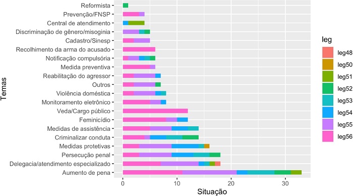 O gráfico 3 mostra os assuntos dos projetos sobre a violência contra a mulher discutidos na pauta ampla da segurança pública no CN entre a 48ª e a 56ª legislatura. Os assuntos permanentes na agenda legislativa em todo o período e com maior volume de proposições foram o aumento de penas, a criação de delegacias especializadas para o atendimento a mulheres, a persecução penal e medidas protetivas de urgência. Recentemente, entraram na agenda legislativa propostas de recolhimento da arma de fogo em posse do acusado e o impedimento da nomeação de condenados por violência doméstica e familiar para cargos públicos e/ou eletivos (veda/concurso público).