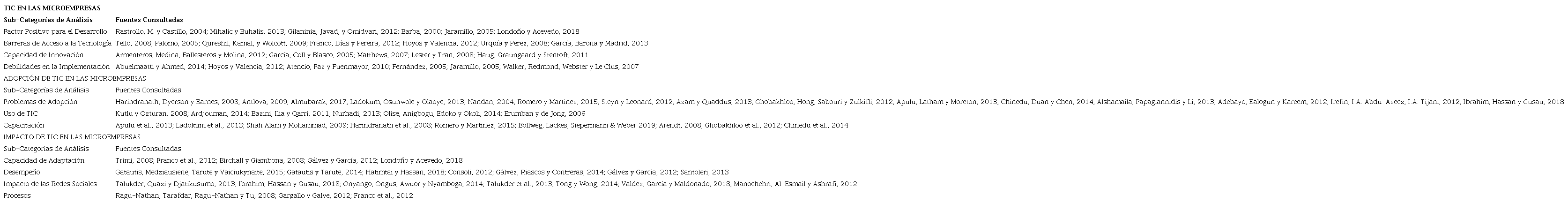 De manera a alcanzar el objetivo de este estudio se procedió a realizar una revisión bibliográfica en la literatura especializada dividiendo la búsqueda en tres diferentes categorías de análisis: las TIC en las microempresas, la adopción de TIC y el impacto de TIC en la gestión administrativa de microempresas. Cada una de estas tres categorías fue dividida en distintas subcategorías de análisis, seleccionando cuatro subcategorías para las TIC en las microempresas, tres subcategorías para la adopción de TIC en las microempresas y otras cuatro subcategorías para el impacto de las TIC en las microempresas. En el Cuadro 1 se observan las fuentes consultadas para cada una de las categorías analizadas y las respectivas subcategorías de análisis.