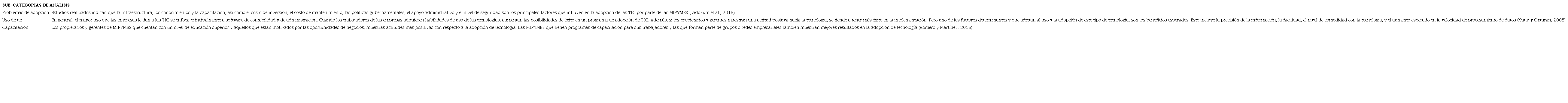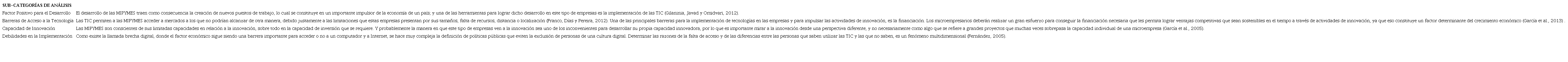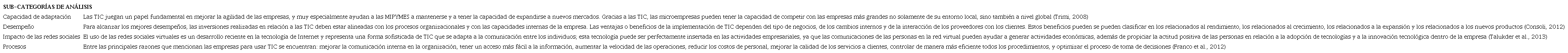 El proceso de innovación dentro de las organizaciones, tiene la influencia de variables internas y externas, además, el tamaño de la empresa está relacionado a la dinámica que estas imprimen a las actividades de innovación (Armenteros, Medina, Ballesteros y Molina, 2012). El crecimiento de las microempresas aumenta la necesidad del uso estratégico de las TIC, y muchas veces este crecimiento se da justamente por las soluciones que aportan las nuevas tecnologías. Así también la falta de adopción de estas tecnologías y las restricciones existentes hacen que muchas microempresas no puedan ser beneficiarias de los efectos positivos de las nuevas tecnologías (Matthews, 2007). En el Cuadro 2 se expresan los puntos más resaltantes analizados en cada subcategoría.