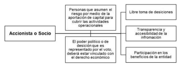 En cuanto a la conceptualización, se ejemplifica como un medio de control de las sociedades categorizadas como mercantiles que busca: El trato equitativo de socios o accionistas (protección de los derechos), Administración con transparencia (políticas administrativas), Claridad y fluidez de la información (comunicación eficiente), Buenas relaciones con los stakeholders (partes interesadas), Información transparente (veracidad de la gestión) y Recomendaciones de gestión en base a la ética (estándares). No obstante, el objetivo se traduce en alinear los intereses y optimizar el valor de la entidad, mediante la fluidez del capital para lograr sostenibilidad a largo plazo cuyos principios son la Igualdad (trato justo en iguales condiciones para los accionistas), Transparencia (rendición de cuentas y castigo o galardón por sus actos), Responsabilidad corporativa (orden social y ambiental) y Voluntariedad (autorregulación). Finalmente, el ámbito alcanza a la administración de recursos de forma eficiente y eficaz con la finalidad de promover el fortalecimiento y sostenibilidad; herramienta adaptativa a necesidades locales y mitigar la corrupción. Y con respecto al Derecho de los accionistas y trato equitativo, se obtiene el siguiente esquema: Ver gráfico 5.