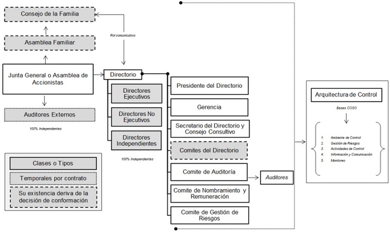 Modelo de Gobierno Corporativo Ecuatoriano: La estructura ecuatoriana recae en la gestión de la Junta General o Asamblea de Accionistas, asimismo, son los encargados de estructurar el Directorio. Es importante destacar que la conjunción de estos enfatiza en el levantamiento de los objetivos estratégicos, valores corporativos, misión y visión de la entidad, los cuales deberán cumplir las expectativas que logren satisfacer sus propósitos empresariales. La estructura naturalizada del directorio empieza con el Presidente del Directorio, el cual tiene la responsabilidad del funcionamiento del directorio, además, de promover el flujo de información; Por otra parte el Secretario del Directorio, es llamado a actuar como consejero del Presidente, además, funcionará como intermediario. Entre los diferentes ejes de especialización para el directorio encontramos al Comité de Auditoría, este eje debe asegurar la transparencia de la información por y para la Junta, en la perspectiva financiera, operativa y de gestión. Por otra parte, el Comité de Nombramiento y Remuneración, tendrá la facultad de designar directores y facultar sus remuneraciones, asimismo, esta entidad tendrá la vocación de convocar, inducir, capacitar, apoyar y evaluar a los nuevos directores. El Comité de Gestión de Riesgos es el responsable de administrar el riesgo operacional en criterio del alcance y la naturaleza en base a la gestión, control y operacionalidad. En una estructura de administración multidireccional el Gobierno Familiar faculta la creación de la Asamblea Familiar, con el objetivo de planificar el patrimonio y evitar conflictos familiares, el mismo eje posee la facultad de crear el Consejo de la Familia el cual posee el rol de evaluación de una o varias actividades previamente designadas. Como último factor, la Arquitectura de Control, es el ensamblaje de la estructura del Gobierno Corporativo basado en el COSO (Committee of Sponsoring Organizations of the Treadway) el cual enfatiza en el control interno, gestión de riesgo y la apostasía del fraude (Gaitán & Niebel, 2015; Quinaluisa, et al., 2018).