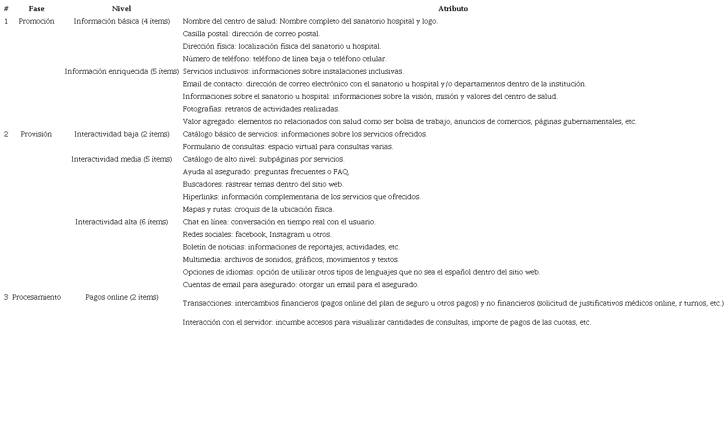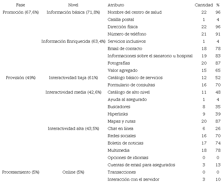 En la Tabla 1, se observó que la fase 1 promoción alcanzó el mayor porcentaje de cobertura (67,6%), seguido de la fase 2 provisión con (49%) y fase 3 procesamiento (5%). En cuanto a los niveles se visualizó que la información básica (71,8%) es la más cumplida seguido de la información enriquecida (63,4%) y una interactividad baja (61%). Los atributos que consiguen un alto porcentaje de cumplimiento son: nombre de centro de salud y dirección física (ambos con 96%); número de teléfono (91%); fotografías, mapas y rutas (ambos con 87%) e informaciones sobre el sanatorio u hospital (83%). No obstante, las transacciones y opciones de idiomas quedan con 0% de cumplimiento. Así mismo, se pudo verificar que los atributos con menor grado de cobertura fueron casilla postal, ayuda al asegurado y servicios inclusivos, todos con 4%.