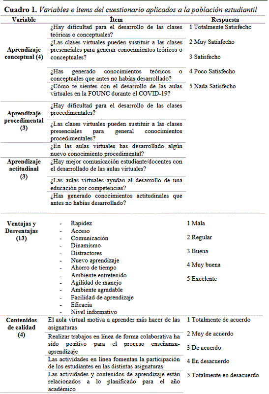 Se enfocó en un estudio cuantitativo de diseño no experimental con corte transversal y descriptivo. La población estuvo compuesta por 98 estudiantes de la Facultad de Odontología de la Universidad Nacional de Concepción (FOUNC), utilizando la totalidad como muestra del estudio por conveniencia. Se obtuvo una tasa de respuesta del 56% correspondiente a 55 participantes. Los criterios de inclusión fueron estudiantes activos-matriculados durante el periodo 2020 y con participación voluntaria, mientras que de exclusión fueron estudiantes activos-matriculados durante el periodo 2020 pero con solicitud de permiso para no cursar el año académico y cursando el sexto curso de la carrera de Odontología. La recolección de datos consistió en la aplicación de un cuestionario electrónico auto administrado mediante la herramienta Google Forms y enviado vía correo electrónico, Messenger y WhatsApp en diciembre del año 2020. El cuestionario estuvo compuesto por una información básica, una pregunta abierta más siete variables y 37 ítems a saber: Aprendizaje conceptual (4), Aprendizaje procedimental (3), Aprendizaje actitudinal (3) Ventajas y Desventajas (13), Contenidos de calidad (4), Tutoría integral (4) y Entorno tecnológico (6) mediante la escala de Likert de 5 puntos (ver cuadro 1). Dicho instrumento fue validado mediante juicio de expertos con docentes investigadores que se desempeñan en el área de la educación superior y uso de plataformas virtuales designado por la unidad de Postgrado de la UNC (ver cuadro 1). Se aplicó la estadística descriptiva para el análisis de datos.