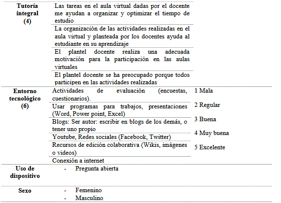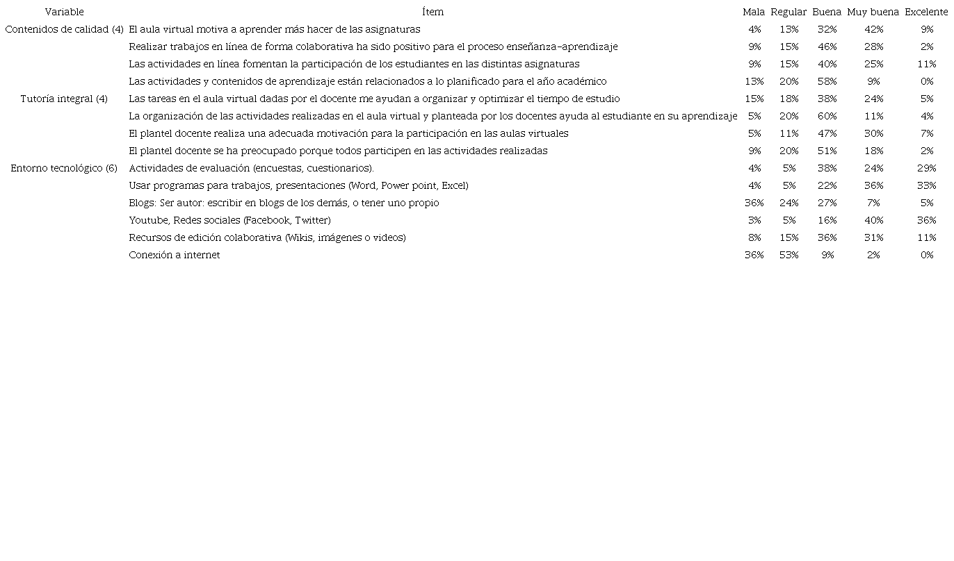 En la Tabla 3 se presenta los resultados obtenidos sobre la variable de Contenidos de calidad, Tutoría integral y Entorno tecnológico desde la perspectiva del estudiante. Un 42% declaran su desacuerdo en la motivación de aprender más dentro de la plataforma virtual, mientras que, un 46% afirman estar de acuerdo que ha sido positivo realizar trabajos en línea de forma colaborativa con sus compañeros y otros 40% de acuerdo con la fomentación de las participaciones de actividades online. Asimismo, 58% manifiestan estar de acuerdo que las actividades y/o contenidos se encuentran relacionados con la planificación de clases. Por lo que toca a las Tutorías integrales, 38% garantizan estar de acuerdo con la existencia de una mejor organización y optimización de estudio con las tareas dadas en el aula virtual, 60% manifiestan su acuerdo en la organización de actividades planteadas por los docentes y si estas ayudan a su aprendizaje, 47% declaran estar de acuerdo con la presencia de una motivación y preocupación en la participación 51%, de estudiantes en las actividades por parte del plantel docente. En cuanto al Entorno tecnológico, 38% valoran como una buena participación en las actividades de evaluación mediante encuestas y/o cuestionarios, 36% califican a si mismo de muy buena en el uso de programas tecnológicos para presentaciones académicas. Un 36% afirman su relación con el Blog como mala. Por el contrario, las habilidades para el uso de redes sociales y aplicaciones de comunicación, 40% se autocalifican como muy buena y 36% excelente. Al mismo tiempo, 36% afirman como buena en el uso de recursos de edición colaborativa. Finalmente, 53% califican como mala a su conexión de internet y acceden a las clases virtuales mediante un Smartphone Android (47%) y 42% con notebook o similares.