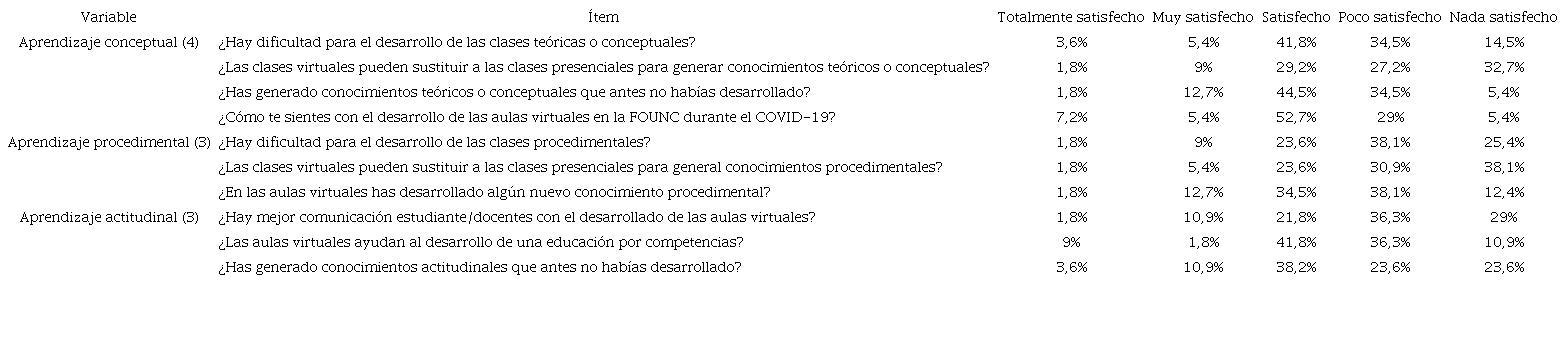 De los 55 estudiantes participantes en el estudio de investigación, 72,8% fueron del sexo femenino y 27,2% del sexo masculino. En la tabla 1 se visualiza las influencias de las aulas virtuales dentro del aprendizaje conceptual, procedimental y actitudinal de los sujetos de estudio. En cuanto a lo conceptual, 41,8% confirman su satisfacción de no tener dificultades con el desarrollo de las clases teóricas seguido de 34,5% quienes se encuentran poco satisfechos. Un 32,7% no se sienten nada satisfechos con que las clases virtuales puedan sustituir a las clases presenciales y 45,5% confirman su satisfacción en relación a la generación de nuevos conocimientos teóricos o conceptuales durante las clases virtuales. Además, se observa que el 52,7% están satisfechos con el desarrollo de las aulas virtuales en la FOUNC durante el periodo de aislamiento. En cuanto a lo procedimental, 38,1% confirman su poca satisfacción de no tener dificultades con el desarrollo de las clases procedimentales seguido de 23,6% quienes se encuentran satisfechos con el desarrollo de las mismas. Un 38,1% no se sienten nada satisfechos con que las clases virtuales puedan sustituir a las clases presenciales para generar conocimientos procedimentales y 38,1% confirman su poca satisfacción en relación a la generación de nuevos conocimientos procedimentales durante las clases virtuales. En el aspecto del aprendizaje actitudinal, 36,3% aseguran estar poco satisfecho con la comunicación existente entre estudiante/docente en el desarrollo de las clases virtuales, seguido de otros 29% con nada de satisfacción. En lo referente a la ayuda o no en el desarrollo de una educación por competencias durante las clases virtuales, 41,8% expresaron su satisfacción y otros 36,3% su poca satisfacción. En lo referente a la generación de conocimientos actitudinales no antes desarrollada en las clases virtuales, 38,2% manifiestan su satisfacción y 23,6% su poca y nada satisfacción respectivamente.
