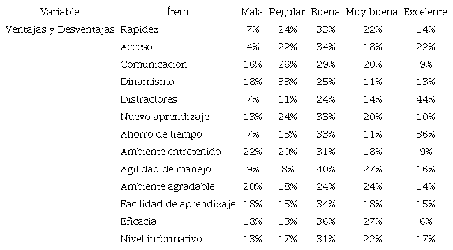 En la tabla 2 se presenta las ventajas y desventajas de las clases virtuales desde la percepción del estudiante. Los ítems con mayor frecuencia se centran en la Rapidez (33%), Acceso (34%), Comunicación (29%), Nuevo aprendizaje (33%), Ambiente entretenido (31%), Agilidad de manejo (40%), Facilidad de aprendizaje (34%), Eficacia (36%) y Nivel informativo (31%) lo valoraron como Buena, mientras que Distractores (44%) y Ahorro de tiempo (36%) como Excelente.