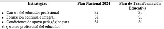 Las estrategias de formación docente continua en el Plan de Transformación Educativa es una continuidad a las definidas en el Plan Nacional 2024, como puede apreciarse en el siguiente cuadro 1.