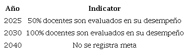 A continuación, se presenta una primera aproximación sobre la comparación de las políticas de formación docente continúa expresadas en el PNTE-2030 y Plan Nacional 2024 (Plan 2024). El PNTE - 2030 define fundamentalmente los logros del desarrollo profesional del docente, es decir, de su formación docente continua, reflejados en logro de metas referidas a la evaluación de desempeño, que se constituye en el indicador de logros (ver cuadro 2):