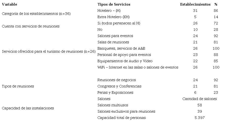 En la Tabla 1 se visualiza que 86% pertenecen a la categoría de hotelero y 72% de los establecimientos cuentan con servicios de reuniones (sólo los H ofrecen el servicio, mientras que ninguno de los XH lo poseen).