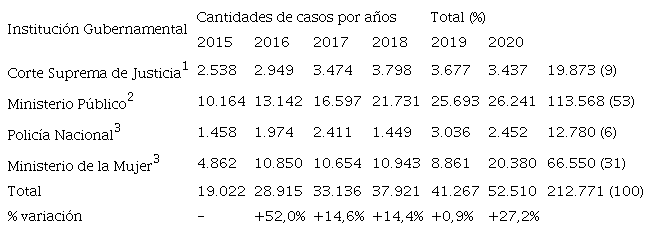 En la Tabla 2 se visualiza que la mayor cantidad de casos se concentran en los años 2020 (52.510) seguido del año 2019 (41.267). Asimismo, el Ministerio Público encabeza en la lista de intervenciones con un total de 53% (113.568) casos. Cabe destacar que el incremento porcentual de los casos fue en descenso desde 2017 al 2019, sin embargo, en el 2020 volvió a elevarse con un 27,2% más que el año anterior.