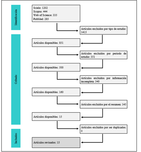 En la figura 1 se observa que, inicialmente, se han obtenido 2266 artículos en las bibliotecas electrónicas tras ingresar los términos clave, distribuyéndose del siguiente modo: Scielo (1202), Scopus (444), Web of Science (335) y PubMed (285). Seguidamente, se descartaron 1415 debido a su tipo de estudio, 351 por el periodo de investigación, 479 por presentar información incompleta 340, y 145 porque el resumen no coincidía con las características temáticas y metodológicas; no se excluyó ningún artículo por duplicidad de la información. Así también, se dispuso de 15 artículos para su revisión con el propósito de examinar y extraer el contenido teórico de cada uno de ellos; esto posibilita la consecución de los objetivos planteados y la formulación de conclusiones razonables.