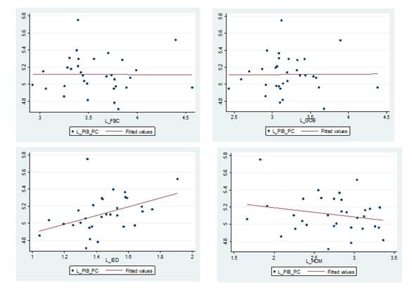 Los resultados del análisis (Figura 1) revelan patrones distintivos entre las variables examinadas y su impacto en el Producto Interno Bruto (PIB) per cápita de los estados mexicanos en 2022. En primer lugar, tanto el Gasto de Gobierno como la Formación Bruta de Capital mostraron una relación prácticamente horizontal en los gráficos de dispersión ajustados, indicando que no existe una relación lineal clara con el PIB per cápita. Esto sugiere que estos factores pueden no tener un impacto directo o linealmente significativo sobre el crecimiento económico estatal.