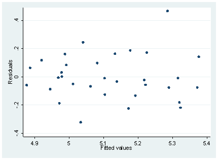 Para evaluar la homocedasticidad, se realizó un gráfico de residuos contra valores ajustados. En el gráfico de la Figura 2 se muestra un patrón aleatorio, lo que sugiere que no hay una variación sistemática de los residuos a lo largo de los valores ajustados, cumpliendo así el supuesto de homocedasticidad.
