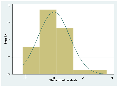 Posteriormente se graficó un histograma para evaluar la normalidad de los residuos (Figura 3), observándose una distribución que sigue una forma aproximadamente normal. Se realizó también una prueba de Shapiro-Wilk, obteniendo un p-value de 0.073. Este valor es mayor al umbral común de 0.05, indicando que no se rechaza la hipótesis nula de normalidad de los residuos. Estos resultados sugieren que los residuos del modelo se distribuyen normalmente, cumpliendo con el supuesto de normalidad.