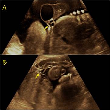 Los quistes únicos pueden remitir a las 12 semanas de gestación2; debido a que durante la formación del cordón umbilical se puede producir un fenómeno transitorio del proceso mecánico7. Ante la persistencia de estos quistes durante el embarazo se debe realizar una evaluación ecográfica detallada del feto especialmente la pared abdominal y el tracto urinario, debido a que la presencia de un quiste en el cordón umbilical de forma aislada no afectaría los resultados perinatales; sin embargo, ante la asociación de anomalías estructurales se debe recomendar el estudio del cariotipo fetal1,3,8. Presentamos un caso con diagnóstico prenatal de quiste verdadero de cordón umbilical confirmado por histología.