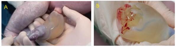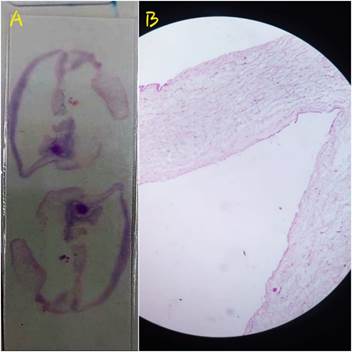 Se sugirió complementar estudios con test de tolerancia oral a la glucosa y control ecográfico. A las 37 semanas de gestación, se realizó ecografía con peso fetal estimado de 4049 g (creciendo en el percentil 100 para la edad gestacional), ILA: 29 cm (aumentado de volumen). Paciente asintomática fue hospitalizada para completar prequirúrgicos, evaluación por endocrinología y programar para cesárea electiva. A los 5 días se realiza la cesárea, reportando: recién nacido vivo, sexo masculino, con peso de 4306 g, 51 cm de talla, 37 semanas por Capurro grande para la edad gestacional, APGAR 7- 9, placenta discoide de 600 g, con inserción central de CU blanco nacarado de 60 cm, con 3 vasos, a 1 cm de la inserción abdominal de CU se observó quiste de 4 x 4 cm con engrosamiento focal de 6 cm de largo con 4 cm de diámetro, de superficie lisa y traslúcido (Figura 3), recién nacido fue evaluado sin ninguna anomalía estructural y hospitalizado por taquipnea transitoria con evolución favorable posterior. En la evaluación microscópica del segmento del CU; a las laminaciones, se observó un aspecto mixoide con una cavidad que presenta un revestimiento citológicamente idéntico al amnios con diagnóstico de quiste amniótico de inclusión (Figura 4).