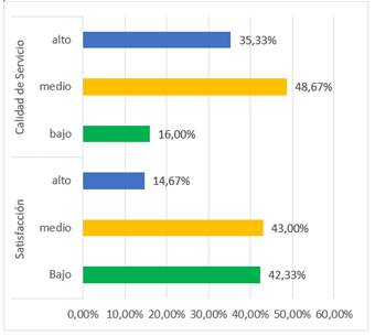 La figura 1 revela que el 48.67% califica la calidad de servicio como nivel medio, y un 35.33% lo percibe como alta. En cuanto a la satisfacción, un porcentaje significativo del 42.33% reporta una baja satisfacción y 43%, indica una satisfacción media.