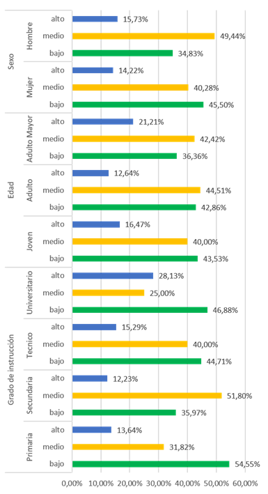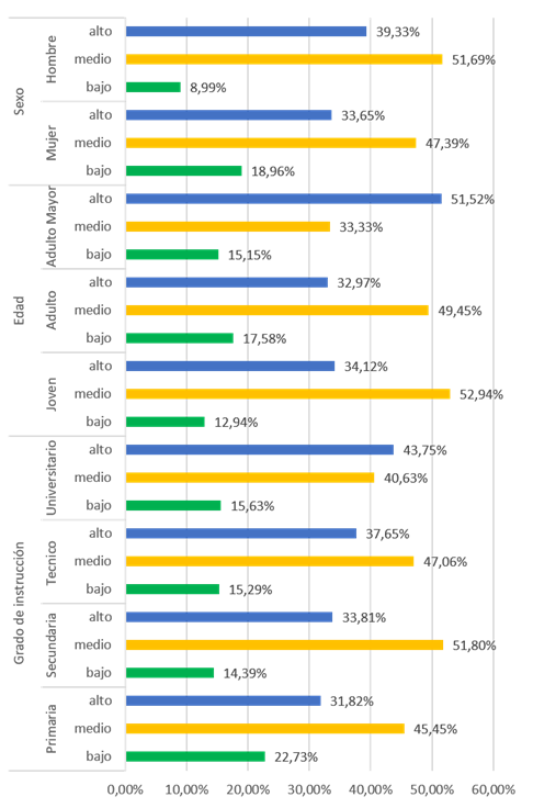 La Figura 3 refleja que 49.44% de los hombres aseguran tener un nivel medio de satisfacción, mientras que el 45.50% de las mujeres sostienen experimentar un nivel bajo de satisfacción. En cuanto a las diferencias por grupo etario, 44.51% de los adultos confirman su satisfacción en el nivel medio, y en el caso de los adultos mayores, el 42.42% comparte esta percepción; sin embargo, los jóvenes lo encuentran en un nivel bajo en un 43.53%. Al evaluar por niveles educativos, el 46.88% de los universitarios, el 44.71% de los técnicos, y el 54.55% de aquellos con educación primaria coinciden en que su nivel de satisfacción es bajo.