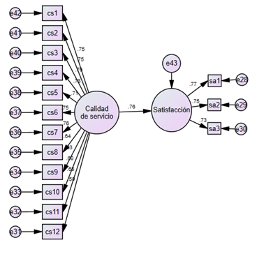 En cuanto a la satisfacción, el alfa de Cronbach es de 0.788, lo que también refleja una buena consistencia interna. La AVE de 0.563 supera el umbral de 0.5, confirmando la validez convergente. La relación HTMT de 0.765 indica una buena validez discriminante, demostrando que los constructos de calidad de servicio y satisfacción son distintos entre sí, aunque la relación es relativamente alta, lo que puede sugerir alguna sobreposición. Y con respecto a la bondad de ajuste del modelo arrojo una ratio χ2/df de 2,640, que generalmente se considera aceptable si el valor está por debajo de 3. Esto indica que el modelo tiene un ajuste razonable a los datos. El Índice de Ajuste Comparativo (CFI) es de 0,937, lo cual es muy bueno, ya que los valores superiores a 0,90 son indicativos de un buen ajuste del modelo a los datos. El Error Cuadrático Medio de la Aproximación (RMSEA) es de 0,074, que está cerca del límite superior de lo que se considera un ajuste aceptable (valores menores a 0,08). El Standardized Root Mean Square Residual (SRMR) es de 0,0435, lo cual es excelente ya que valores menores a 0,05 indican un buen ajuste del modelo.