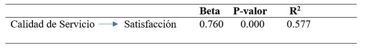 En la Figura 4 y tabla 2 se muestra el análisis de la relación entre la calidad del servicio y la satisfacción hospitalaria. Se observa que el coeficiente Beta para la calidad del servicio en relación con la satisfacción es de 0.760, indicando una fuerte relación positiva, es decir, cuando la calidad del servicio aumenta, la satisfacción hospitalaria también tiende a aumentar de manera significativa. El p-valor asociado con este coeficiente es de 0.000, lo que sugiere que esta relación es estadísticamente significativa y que es muy poco probable que este resultado sea producto del azar. Además, el R² de satisfacción es de 0.577, lo que significa que aproximadamente el 57.7% de la variación en la satisfacción hospitalaria puede ser explicada por la calidad del servicio. Este es un porcentaje sustancial, indicando que la calidad del servicio es un predictor importante de la satisfacción del paciente en el contexto hospitalario.