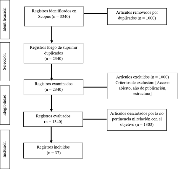 La figura 1 presentó un resumen del proceso llevado a cabo en este estudio. En primer lugar, se accedió a la base de datos Scopus, donde se identificaron inicialmente 3340 artículos. Posteriormente, se procedió a eliminar 1000 artículos duplicados, lo que resultó en un total de 2340 artículos únicos. Luego, se aplicaron criterios de exclusión, como el tipo de acceso (abierto), el año de publicación y la estructura, lo que llevó a la eliminación de otros 1000 artículos. Finalmente, se descartaron 1303 artículos adicionales debido a su falta de pertinencia y su falta de relación con el objetivo de la investigación. Finalmente, se analizaron 37 artículos de entre los analizados.