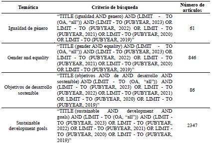 El estudio se enfocó hacia una revisión sistemática. Se analizó artículos sobre el ODS 5 Igualdad de género publicados en revistas indexadas en la base de datos Scopus, obtenidos en julio de 2023. Los criterios de inclusión se establecieron mediante palabras clave específicas (Igualdad de género, gender and equality, Objetivos de Desarrollo Sostenible y Sustainable Development Goals), abarcando el periodo comprendido entre 2019 y 2022 (ver tabla 1).