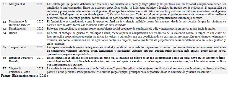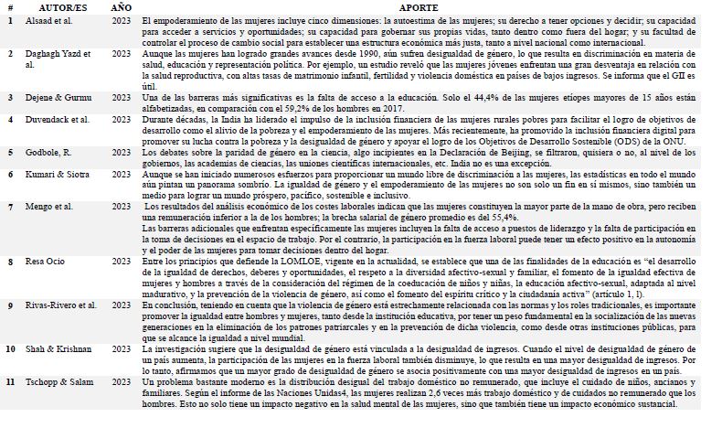 Se examinaron un total de 37 estudios relacionados con la Igualdad de género en la base de Scopus. La tabla 1 presenta el número de publicaciones por año: 11 en 2023, 10 en 2022, 7 en 2021, 7 en 2020 y 2 en 2019 junto con la información sobre sus autores y contribuciones correspondientes.