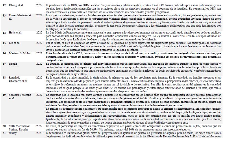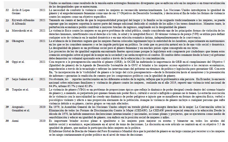 RESUMEN: El estudio tiene como objetivo el análisis de las investigaciones relacionadas con el Objetivo de Desarrollo Sostenible número 5 (ODS 5) Igualdad de género, en el marco de las desigualdades, violencia y el empoderamiento de la mujer. El estudio se enfocó hacia una revisión sistemática en Scopus en el 2023. Los criterios de inclusión se establecieron mediante palabras clave específicas (Igualdad de género, gender and equality, Objetivos de Desarrollo Sostenible y Sustainable Development Goals), abarcando el periodo comprendido entre 2019 y 2022. Se localizaron 3340 investigaciones y 37 fueron analizados según parámetros establecidos. El hallazgo principal revela que, a pesar de los esfuerzos y compromisos internacionales por promover la equidad de género, persisten desafíos significativos en ámbitos como la educación, la participación laboral, las disparidades salariales y la violencia contra las mujeres. Como reflexión final, se destaca que el camino hacia la igualdad de género y el empoderamiento de las mujeres exige un compromiso continuo por parte de los gobiernos, las instituciones y la sociedad en su conjunto. La promoción de políticas inclusivas y la erradicación de estereotipos de género resultan fundamentales para edificar un mundo más justo y equitativo para todas las personas, sin importar su género.