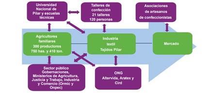 En la figura 1 se visualiza la cadena de valor productiva del sector algodón-textil-confecciones de Ñeembucú con sus respectivos integrantes: