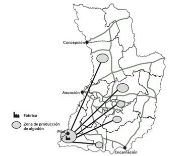 En la figura 2 se puede observar las ubicaciones de la fábrica y las zonas de producción de algodón.