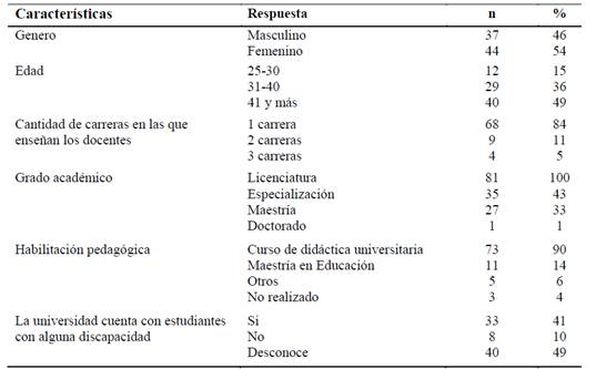 En la investigación cuantitativa participaron 81 docentes universitarios, 54% de los docentes son de sexo femenino, 49% tienen entre 41 años y más de edad y 84% imparten sus clases en una sola carrera. En cuanto a la formación académica; 100% poseen una licenciatura, 43% especialización y 90% didáctica universitaria. El 49% de los docentes desconocen de la existencia de estudiantes con necesidades educativas especiales en la universidad (ver tabla 1).