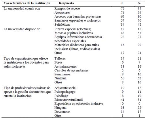 En cuanto a la infraestructura de la institución, 94% de los encuestados afirmaron que la institución cuenta con rampas en las entradas y con ascensores, 80% que dispone de barandas protectoras en los accesos, 70% de sanitarios inclusivos y 53% que posee mesas o pupitres inclusivos. No obstante, 62% manifestaron que la institución no ofrece ninguna capacitación sobre enseñanzas en aulas inclusivas y 50% reconocieron la existencia del departamento de bienestar estudiantil para apoyo a la gestión docente en el tema de la inclusividad (ver tabla 2).