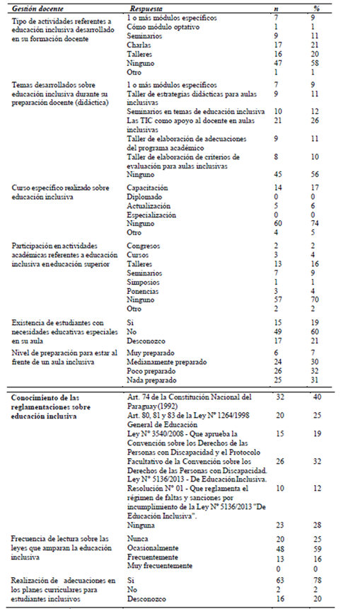 Respecto a las actividades desarrolladas durante la formación del docente referente a la Educación Inclusiva, 58% no realizaron ninguna actividad en su formación del profesorado, 56% no tomaron cursos del tema durante su preparación docente, 74% no realizaron ningún curso específico referente a la Educación Inclusiva y 70% no han participado en ninguna de las actividades académicas referente a la Educación Inclusiva en Educación Superior. El 60% respondió que desconocen si tienen estudiantes con necesidades educativas especiales en su aula y 32% se sienten poco preparados para estar al frente de un aula inclusiva. En cuanto a las reglamentaciones sobre la Educación Inclusiva, 40% de los docentes afirmaron conocer el Artículo 74º de la Constitución Nacional, 59% que han realizado una lectura de forma ocasional de las leyes que amparan a la Educación Inclusiva y 78% que se deben realizar adecuaciones a los planes curriculares para estudiantes inclusivos (ver tabla 3).