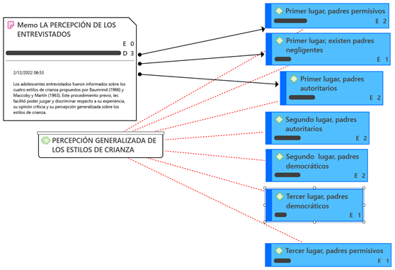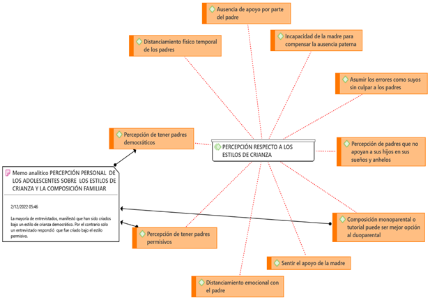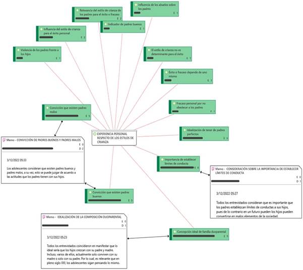 En esta primera subcategoría, mediante códigos, se destaca la coincidencia de todos los entrevistados en la importancia de establecer límites en el estilo de crianza. Los entrevistados reflexionan sobre las posibles consecuencias negativas si los padres no establecen límites. Además, todos están convencidos de la existencia de padres buenos y malos, dependiendo de la forma en que críen a sus hijos. Además, se evidencia que todos idealizan la composición familiar duoparental, considerando que es lo óptimo para el crecimiento de los hijos junto a su papá y mamá. Los memos refuerzan la interpretación de los códigos más relevantes (ver figura 3).