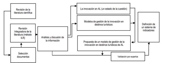 Y se aplicó el modelo de Integrative Literature Review (ILR) desarrollado por Torraco (2005) (ver figura 1). Se formularon preguntas clave para responder: ¿Cuál es el concepto y enfoque de la innovación en América Latina?, ¿Cuáles son los factores que representan las brechas más significativas en innovación en América Latina, en comparación con otras regiones globales? y ¿Qué elementos integran los modelos de gestión de la innovación en los destinos turísticos y cómo se relacionan entre sí?