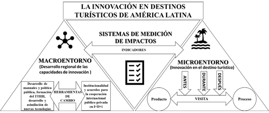 Vera et al. (2019) presentan un modelo basado en la combinación armónica de las áreas de innovación, dimensiones temporales y sectoriales. Aunque el modelo puede presentar limitaciones en cuanto a sus componentes, resalta la importancia de gestionar la innovación no solo para el disfrute del visitante in-situ durante su permanencia en el destino, sino también la conexión previa con él y el seguimiento de la experiencia en el contexto post visita. En el contexto territorial de AL, las capacidades de innovación de los países son muy limitadas y desiguales, como se lo ha discutido anteriormente, lo cual debe ser considerado al momento de planificar un sistema local que permita innovar, por lo cual, es necesario integrar elementos de carácter regional para su gestión.