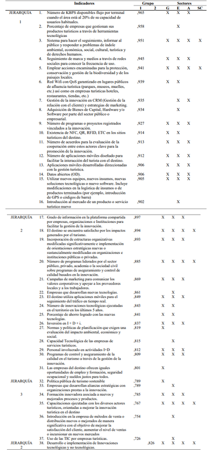 En la tabla 3, se presenta que aquellos con varianza superior a 0,9 puntos se consideran más urgentes y pertenecen a la jerarquía 1; los que tienen un peso entre 0,8 y 0,9 forman la jerarquía 2, destacando por su importancia para la innovación en el destino, aunque su implementación no es inmediata; la jerarquía 3 abarca indicadores con un peso entre 0,7 y 0,8, asignándoles una relevancia aceptable con la posibilidad de implementación a mediano y largo plazo. Es relevante señalar que los indicadores seleccionados provienen de los grupos 1 y 2 que surgieron del análisis factorial y que concentran la mayor varianza.