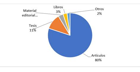 En la Figura 3 se refleja que el 79% corresponde a artículos, seguido por las disertaciones de tesis, que representan el 11%.