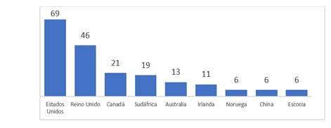 En la Figura 4 se resalta que Estados Unidos lidera con 69 publicaciones (30%), seguido por el Reino Unido con 46 (20%) y Canadá con 21 (9%).