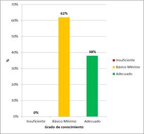 El puntaje promedio expresado en porcentaje fue de 76%. De los 13 docentes evaluados, ninguno registró conocimiento insuficiente, la mayoría alcanzó conocimientos básicos mínimos. Figura 1.