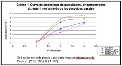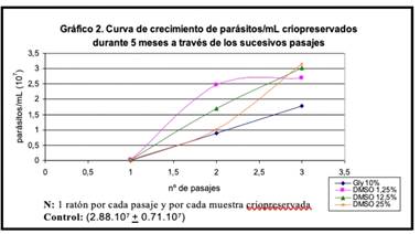 En el segundo pasaje de las muestras criopreservadas durante un mes, la concentración de parásitos fue semejante al control, no existiendo diferencias significativas. Sin embargo, para las muestras criopreservadas durante 5 meses recién en el tercer pasaje la concentración de parásitos se iguala al control.