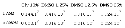 El glicerol tuvo un comportamiento semejante al DMSO de concentración de 1.25% a los un mes, pero a los 5 meses obtuvimos menor cantidad de parásitos, con lo cual se observa la necesidad de continuar probando las muestras criopreservadas a los 12 meses de la criopreservación para constatar la viabilidad de los parásitos.