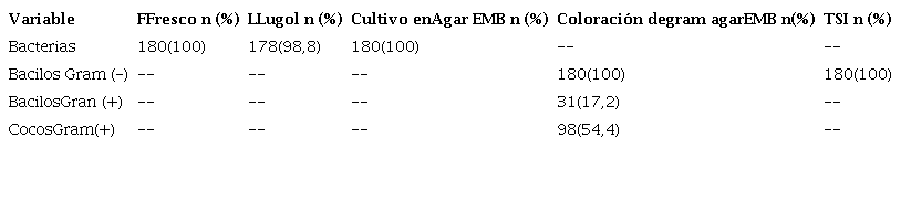En un total de 180 macerados de plantas medicinales se encontró una gran diversidad de microorganismos contaminantes, entre los cuales se ha demostrado la elevada contaminación con bacterias de tipobacilar y con forma de cocos. Se procedió a la examinación de muestras en fresco, teñidas con lugol y a la observación posterior al crecimiento en dos medios de cultivo diferentes. Las cargas bacterianas que fueron encontradas se expresan en porcentajes y se muestran en la tabla 1.