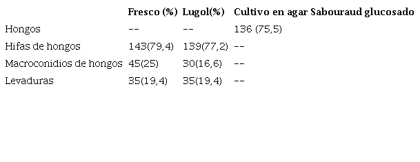 Los resultados obtenidos respecto a la contaminación con hongos demostraron que en más del 70% de los macerados se encontraron plantas contaminadas con hifas de hongos y en porcentajes menores se encontraron levaduras y estructuras correspondientes a macro conidios fúngicos (tabla 2).
