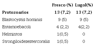 Para la búsqueda e identificación de los parásitos presentes en los macerados se utilizó el método directo de preparación y observación sobre lámina porta objetos en el microscopio del laboratorio de microbiología. La misma muestra fue sometida a tinción con lugol. Las especies de parásitos hallados se muestran en la tabla 3.